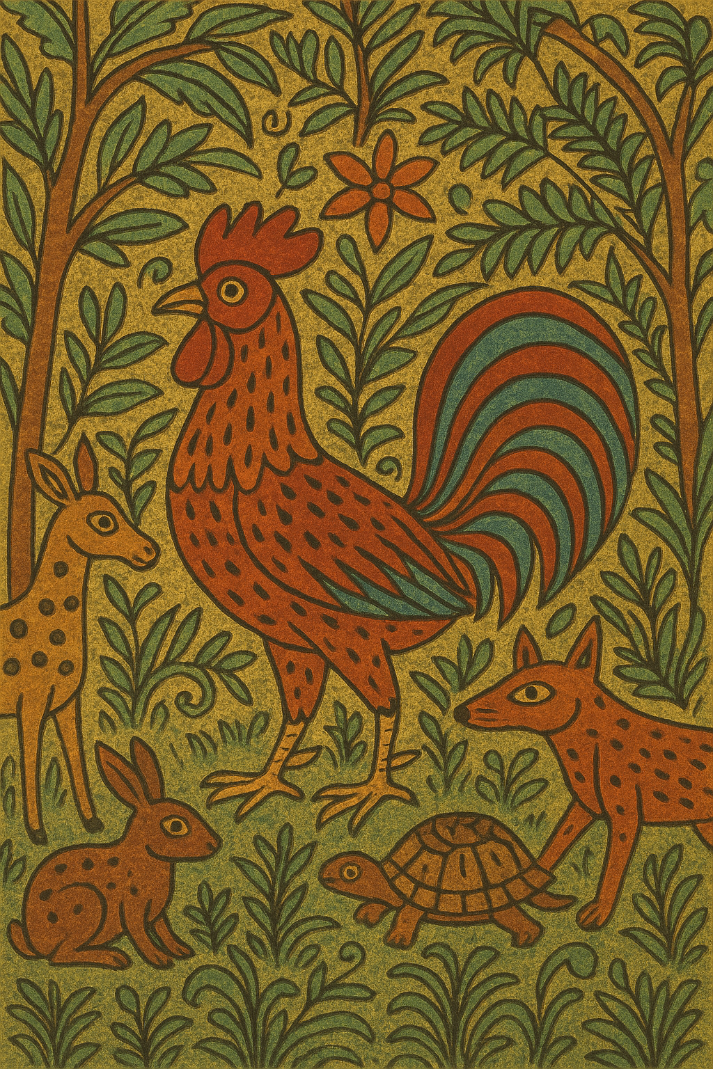 Gond artists believe that everything in nature is alive — trees, animals, rivers, even rocks have spirits. Their paintings depict this animism, using bold lines, vibrant colours, and intricate patterns. Common motifs include: